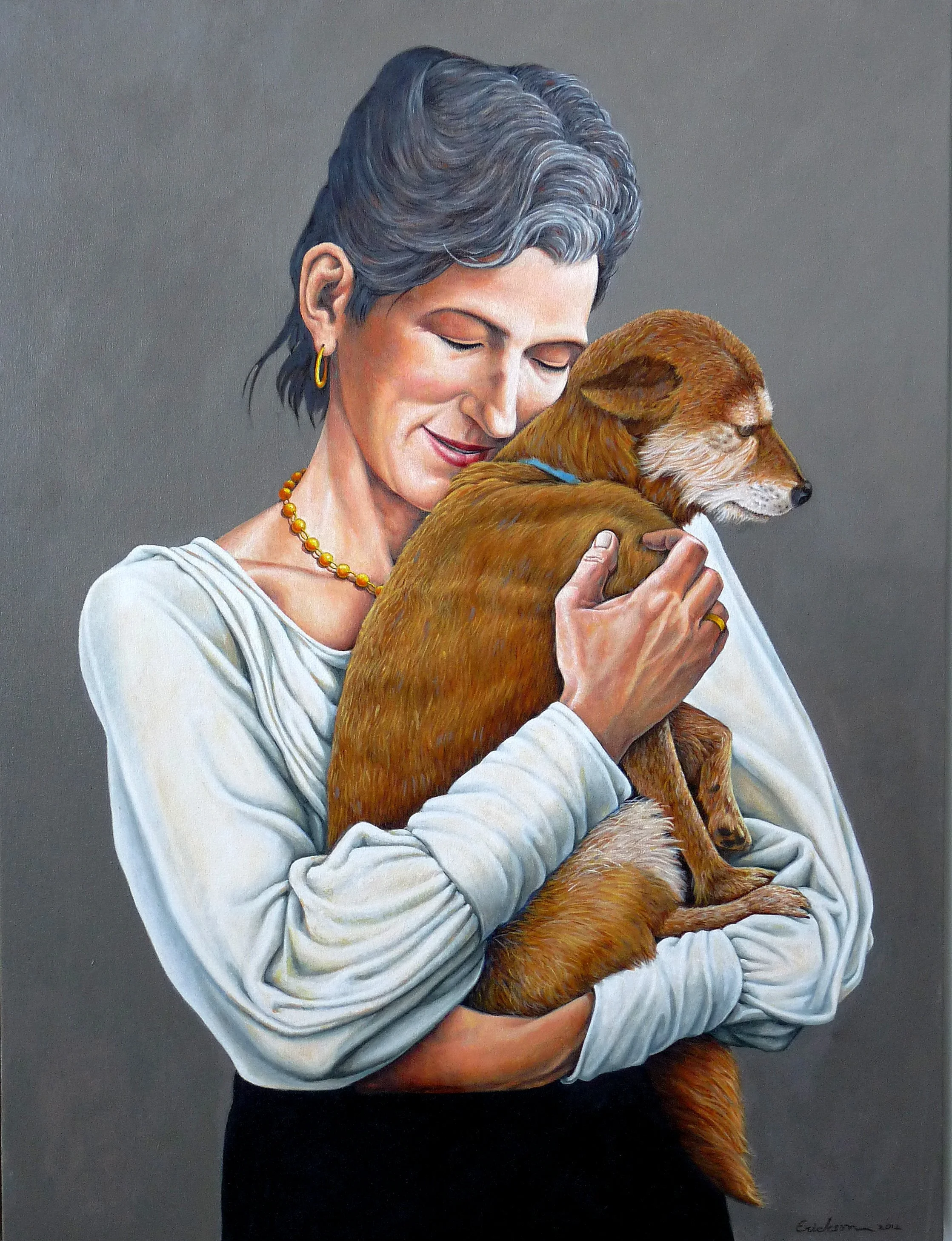 “Lorraine and Samba” – This painting is a special portrait of Lorraine and our dog Samba. Lorraine and l have been together since 2011. Samba passed away a couple of years ago just after I finished this painting. I say that it’s a special painting because we both met each other through Samba. I was dog sitting for a friend of mine who was friends with Lorraine, so the dog brought us together in an indirect way. In the painting I was attracted to the way the white blouse and Lorraine’s arms hold the shape of the dog in place. Samba is not very happy in the painting. If you know anything about dogs, you know that when their ears are back against their head, they are uncomfortable. My main influence in doing the painting is from a painting that l saw in the Milwaukee Museum of Art by Dutch artist Kees Van Dogen, a 20-century artist who lived in Paris with Picasso. It’s of a woman holding a cat and is much more abstract than my painting of Lorraine and Samba although l believe that the feelings are comparable in both paintings. Although our days with Samba are over, our love for him remains in our hearts and this painting.