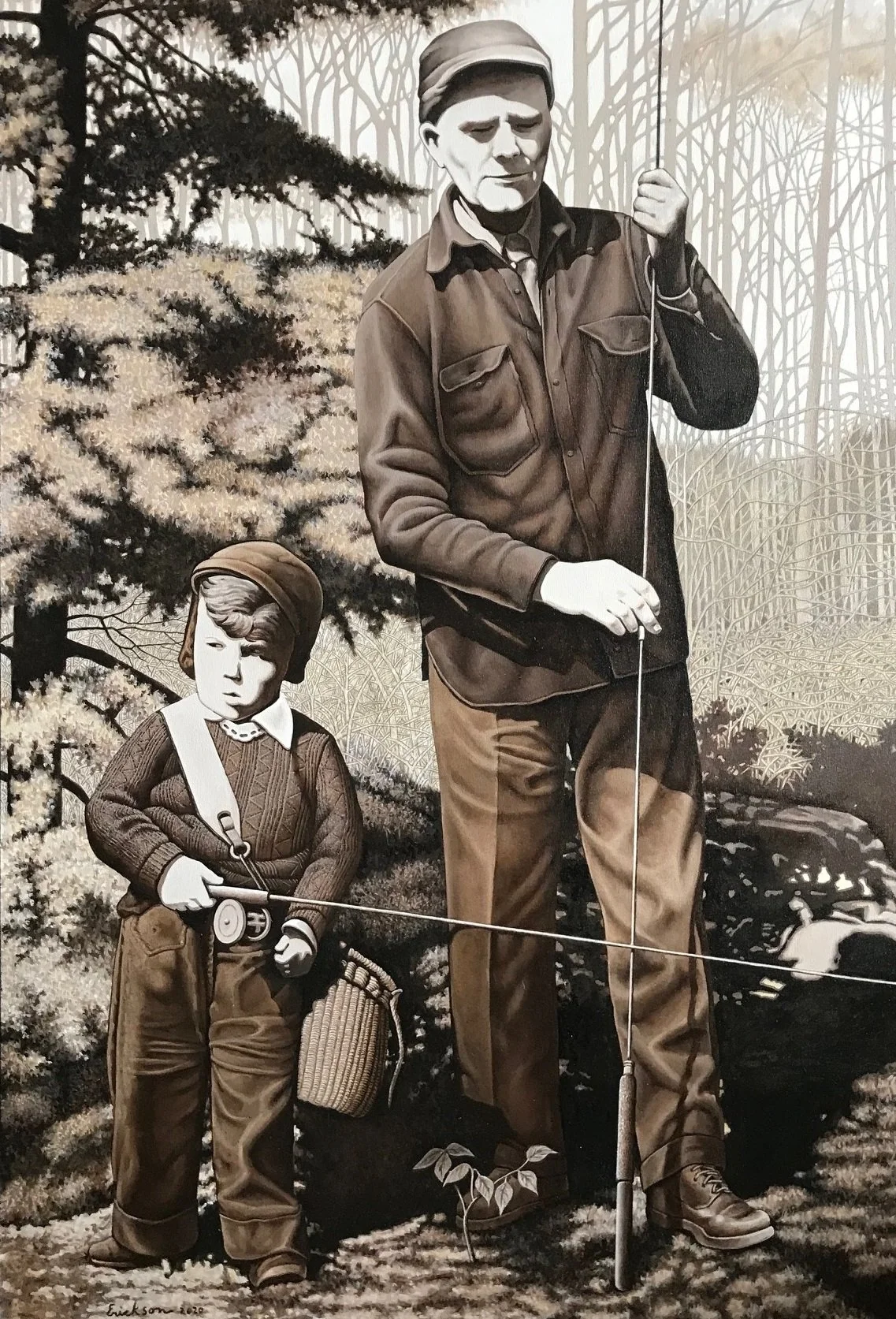 “Title” – This painting, in vintage shades of grey and brown, depicts a young Dale fishing with his grandfather. Unlike his other works, which almost always depict subjects from his personal photography, Dale chose this particular photo, taken in 1947, to represent memories of his grandfather and because of the composition’s prominent vertical emphasis. One of only a handful of paintings which reject naturalistic colour, Dale creates a sophisticated illusion of depth through a limited colour palette, utilising tonal variations to draw his viewers into the pictorial space. The viewers eyes are instantly drawn to the oversaturated face of a young Dale, who recalls that he didn’t much enjoy the bug-filled forest and shrubbery that came with the task of trout fishing, but cherished time spent with his Grandfather. Behind the two figures lies a backdrop of a hazy forest, further evoking a sense of receding space. A snapshot of a single moment, leads to myriad of memories twisted between tree trunks.